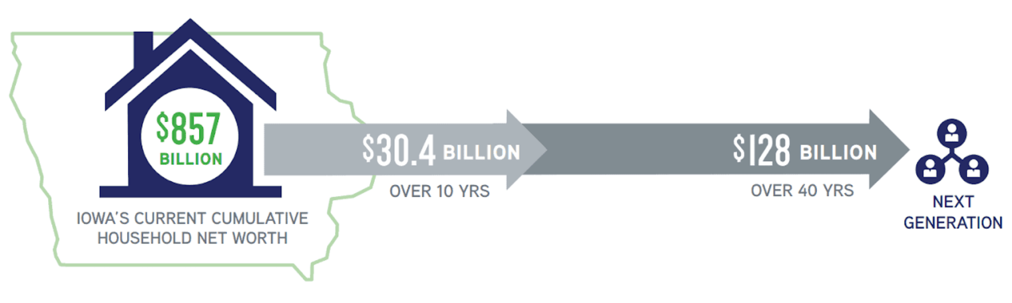 Over the next 40 years in Iowa, more than $128 billion will change hands, from one generation to the next. This intergenerational wealth may be held in real estate or farms, stocks or securities, retirement accounts, and other assets. Some will go to taxes, but most will go to heirs. And many of those heirs no longer live where the wealth was built. Now is the time to plan a legacy of giving that preserves generational wealth.